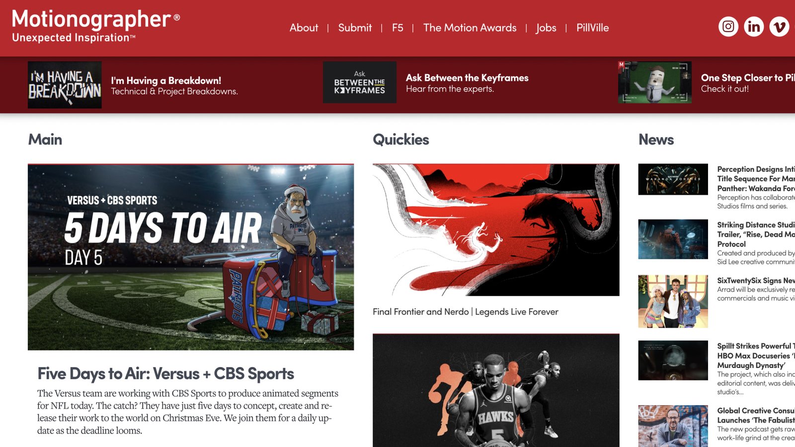 For the past five years, Versus has partnered with CBS Sports to produce animated segments for NFL today, dubbed “Quick Facts.” These one-minute narrative animations are both fun and timely, but being topical comes at a cost. The team has just FIVE DAYS to concept, create and release their work to the world. In an industry where everyone is desperate for more time, “if only I had another week, I could have created a masterpiece,” Versus charged headfirst into the challenge and Motionographer was there every step of the way with a daily diary that led readers experience the rising tension of a looming deadline and how the best in the business handle the pressure.